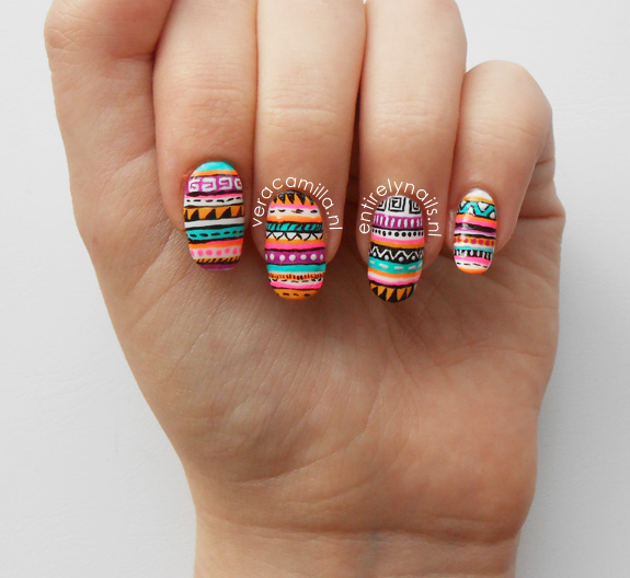 Klaar! Je kan op de andere nagels hetzelfde maken, of nog een uurtje doorgaan zoals ik heb gedaan. Als je dit te druk vindt, of als je geen hebt tijd, lak dan je andere nagels in een kleurtje die ook in je nail art verwerkt zit. En vergeet de topcoat niet! Topcoat maakt het geheel mooi egaal en laat de nagellak langer zitten.